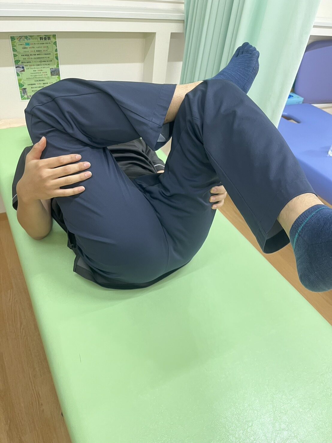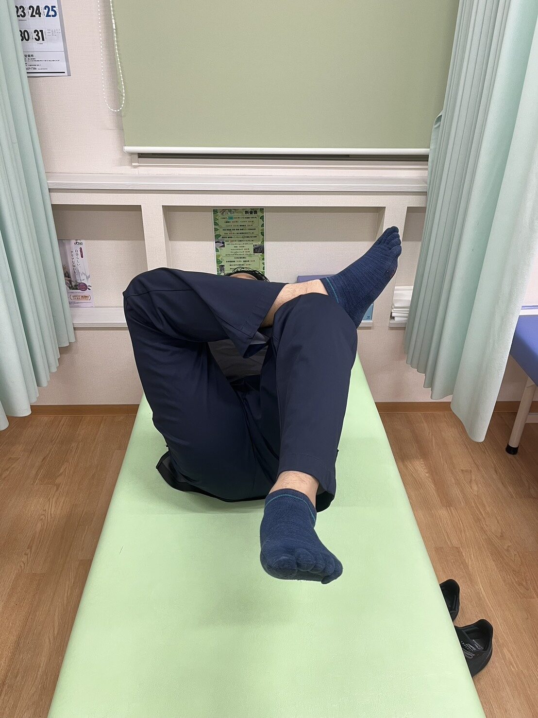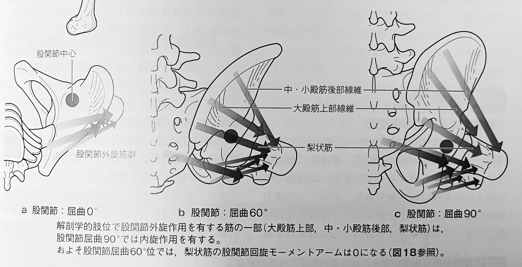 しかし、梨状筋は股関節の屈曲角度によってその作用が逆転します。普通に立っているときや寝ている時は外旋作用を持ちますが、股関節屈曲60°になると回旋作用がなくなり、それ以上の角度になると股関節回旋軸の前方に梨状筋が位置するため、内旋作用が生まれます(外転作用は変わらず)。つまり、股関節90°屈曲位で股関節を外転せず外旋すると梨状筋を伸ばせます。