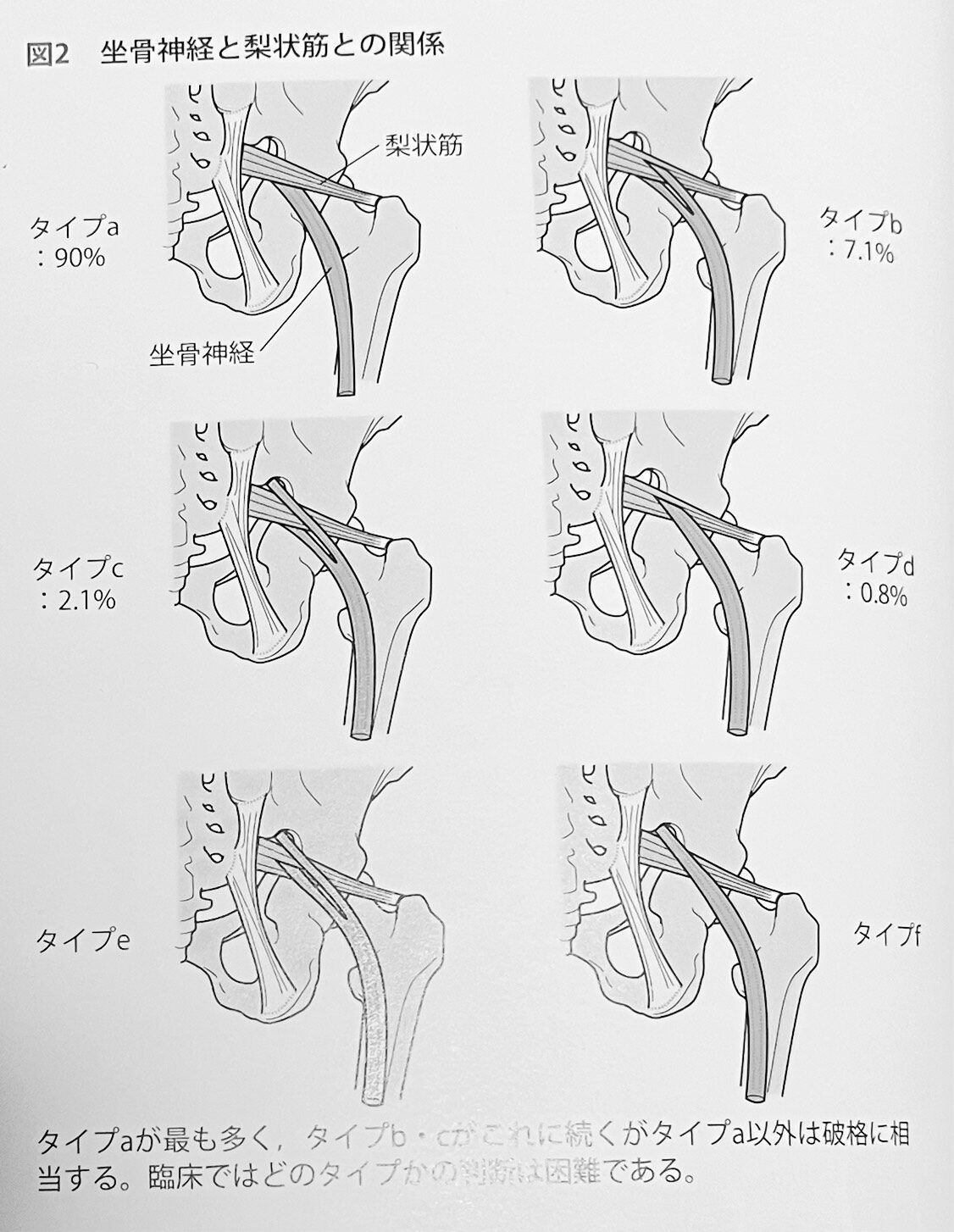 ※9割の方は梨状筋の下(梨状筋下孔)を坐骨神経が走行していますが、神経が二股に分かれ一部梨状筋を貫いているタイプbや上下を走行するタイプcなど個人差があります。しかし梨状筋のすぐそばに坐骨神経が走っていることに変わりはありません。