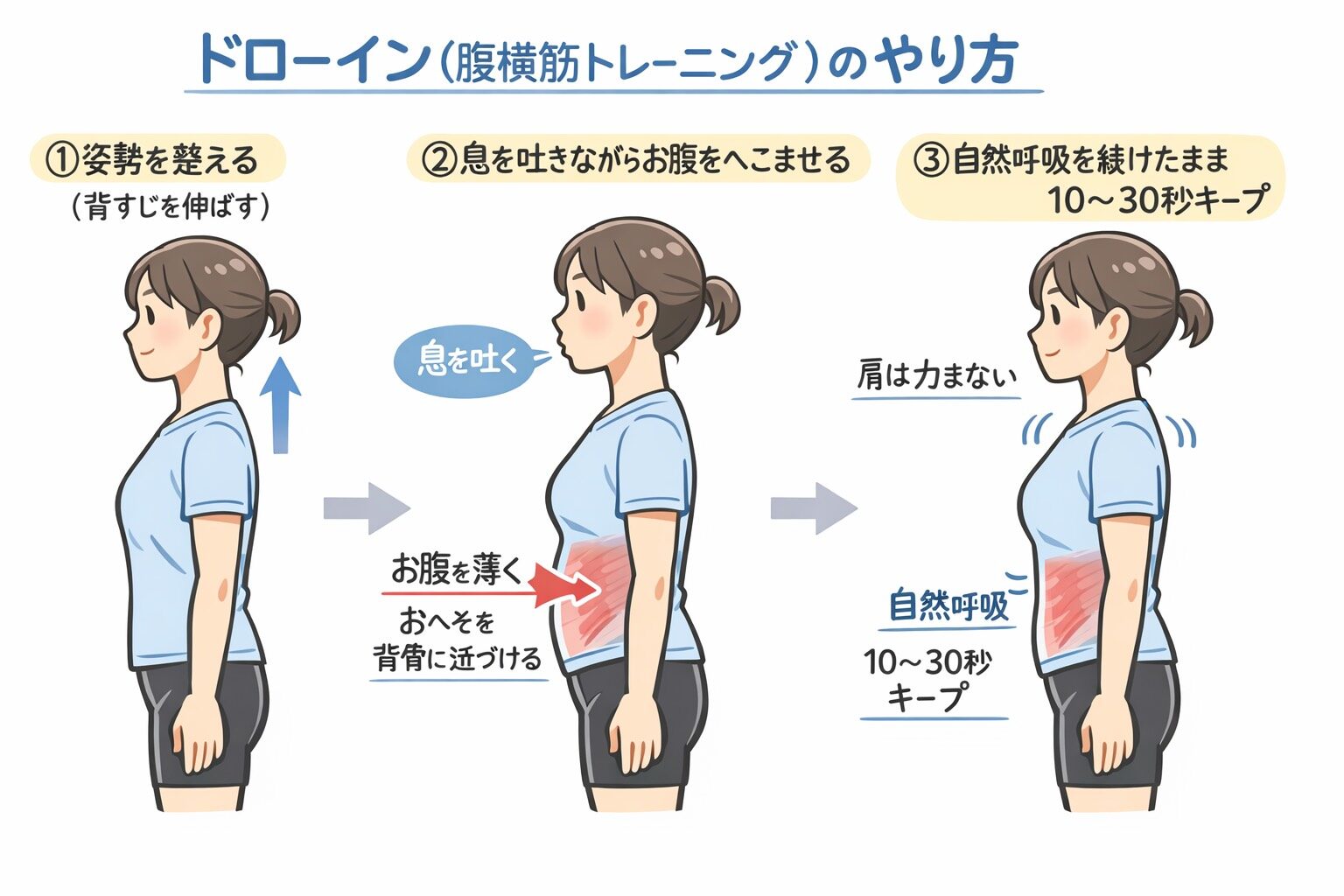 • 数秒間保持: お腹を引き込んだ状態を10秒間維持する。